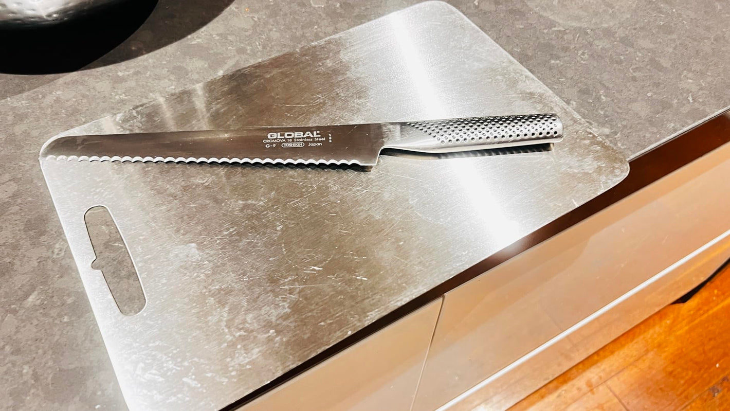 Steel is ultra-hygienic and durable; like all metal surfaces, it can dull blades faster than wood, regular honing recommended.